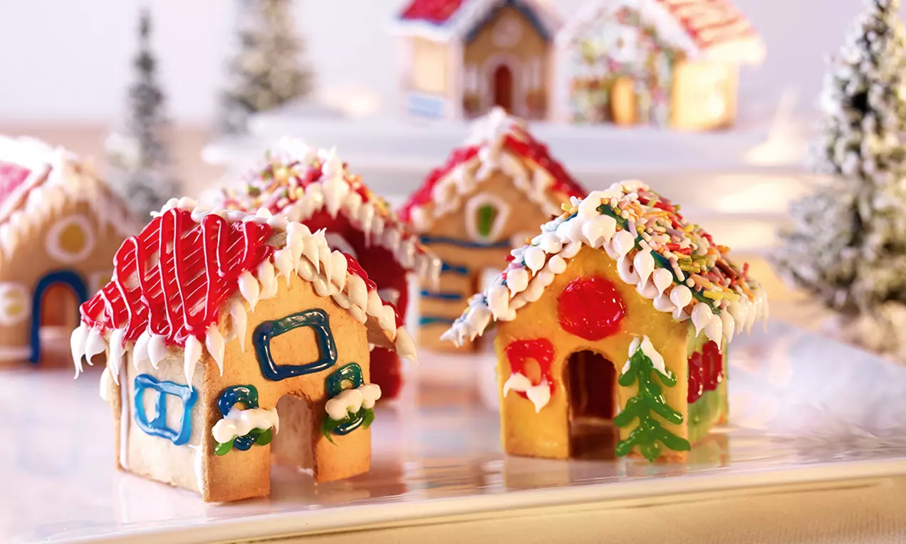 Se asamblează căsuțele cu creionul alb de zahăr, astfel: întâi se fixează pereţii laterali între faţade şi apoi se aşază acoperişurile, consolidând din loc în loc. Se decorează acoperişurile cu creioanele pentru decor sidefate și se presară ornamentele colorate. La sfârșit se decorează căsuțele cu creioanele de zahăr colorate.