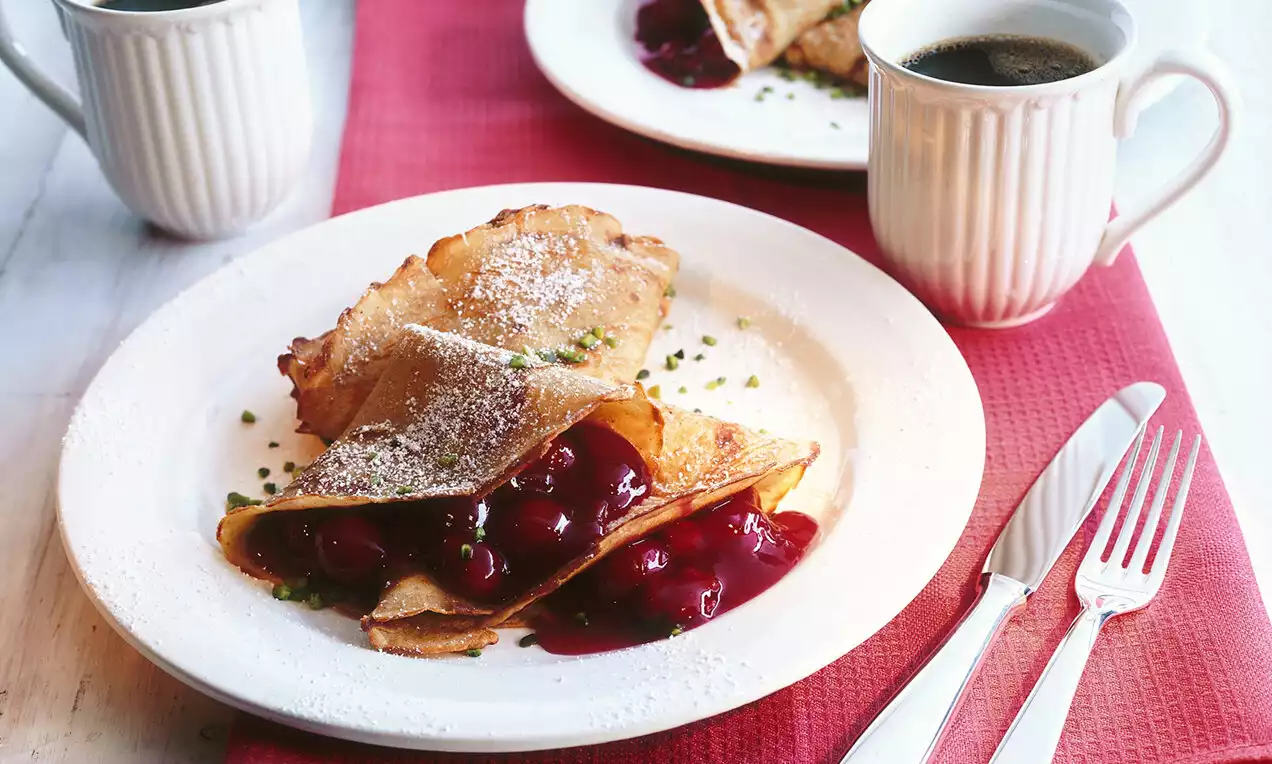 Clătitele se ung pe jumătate din suprafață cu dulceață de vișine. Clătitele se împăturesc apoi prima dată pe jumătate apoi încă dată pe jumătate pentru a se forma triunghiuri.