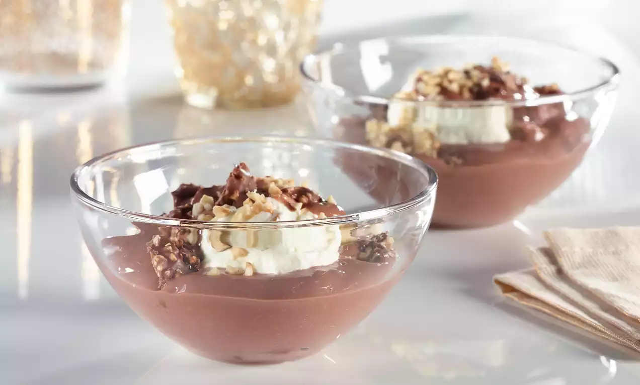 Desertul de ciocolată se toarnă în 4 vase de desert (se lasă deoparte 4 linguri). Frișca se repartizează în mijloc, peste budincă, iar peste frișcă se adaugă câte o lingură de budincă (din cele puse deoparte). Se presară alune feliate.
