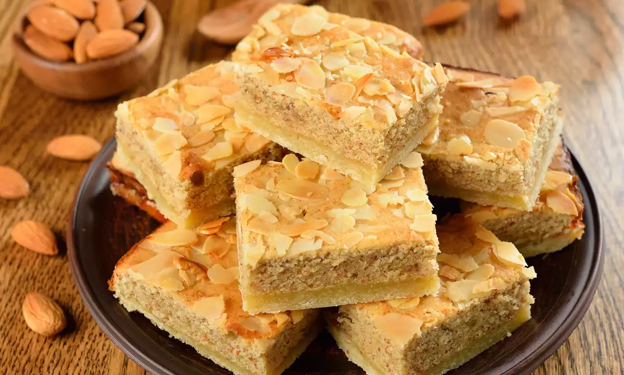 Crema se întinde peste aluat, iar peste ea se presară migdalele. Tava se reintroduce în cuptor urmând a se continua coacerea încă 15 minute, la același temperaturi indicate mai sus.