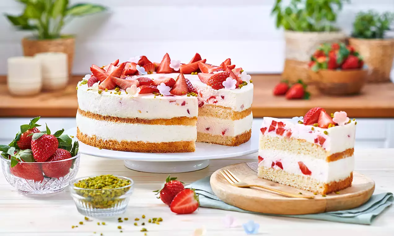 Tortul vegan cu căpșuni se păstrează la rece până la servire.
